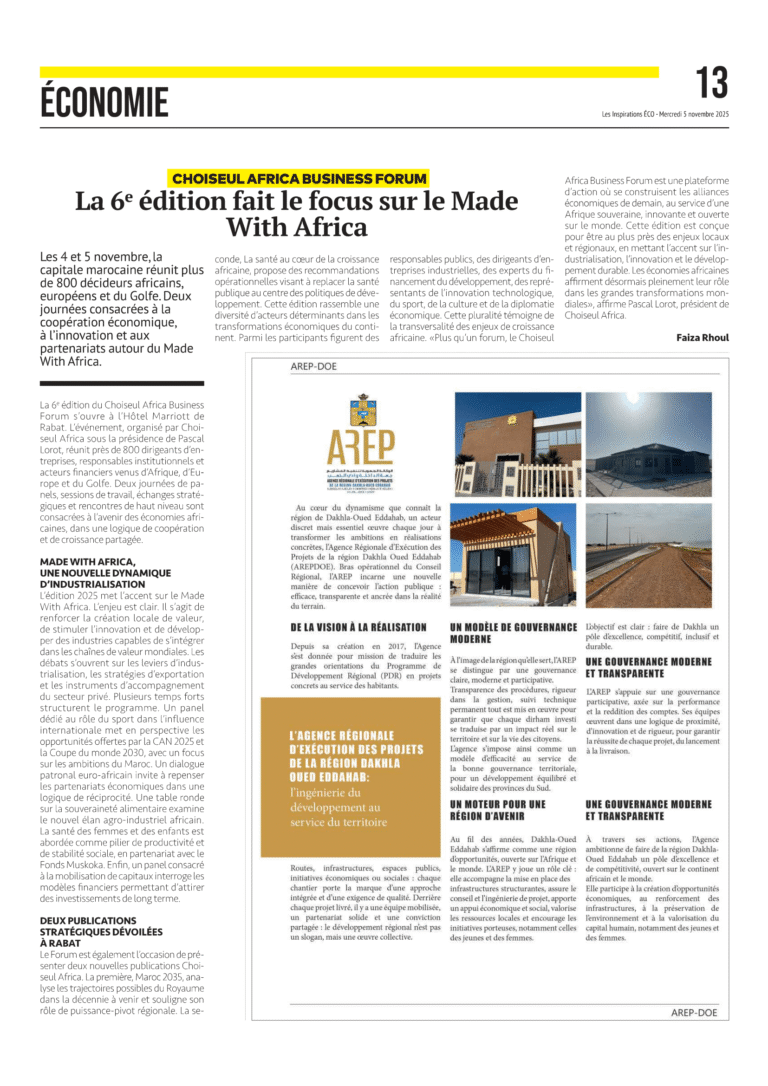 L’Agence Régionale d’Exécution des Projets de la région Dakhla-Oued Eddahab a été récemment mise en lumière dans Les Échos, l’un des magazines de référence en matière d’économie, de développement territorial et d’innovation publique.